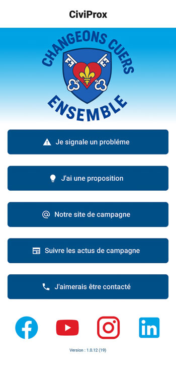 Avec « CiviProx Cuers », nous lançons une application simple et concrète. Un outil où vous pouvez signaler les problèmes du quotidien, proposer vos idées pour Cuers, suivre notre action et nous contacter directement.
